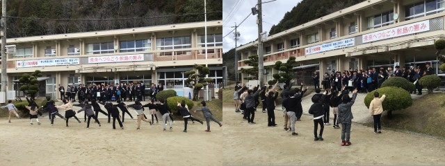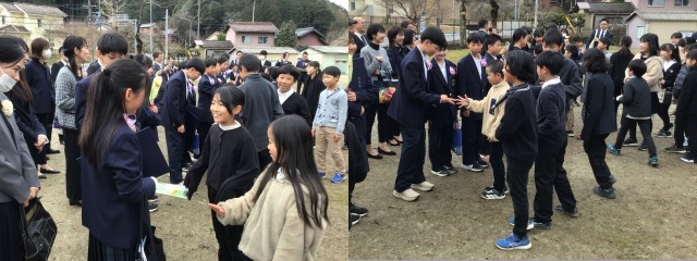 門出送りの様子です。在校生が卒業を祝うダンスを披露した後、花アーチで正門まで送りました。最後にそれぞれメッセージを伝えたい6年生のところへ行って、感謝の気持ちを伝えました。