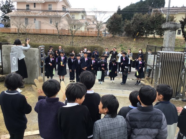 在校生への感謝とねぎらいの言葉を述べた後、卒業生は「せーの」で正門から一歩踏み出していきました。