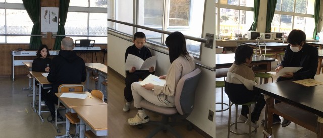 写真中・下:担任から一人一人に通知表を手渡し、評価についての話や本人の頑張りについて、担任の思いを伝えました。