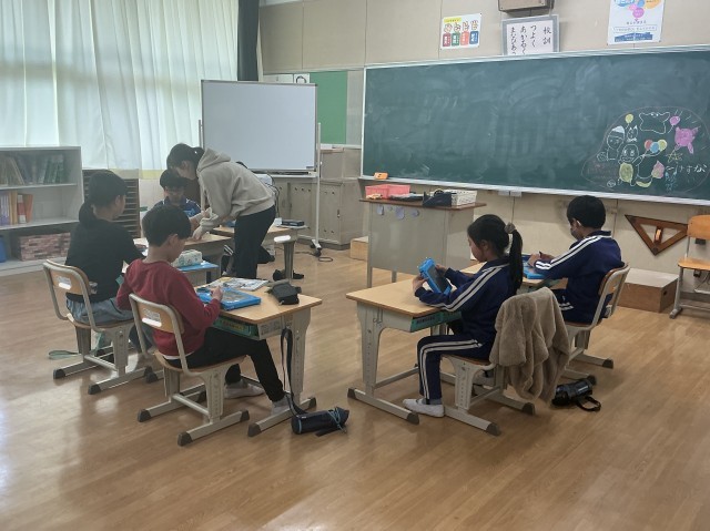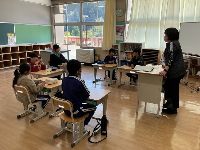 写真上:書写の授業の様子です。書写は教頭が担当します。今日は初めての授業なので、自己紹介や敷島(旭)地区の紹介などを行いました。「榊野温泉があるよ」「棒の手が3つ(の流派が)あるよ」と、地域のよいところをたくさん挙げていました。