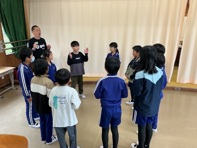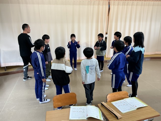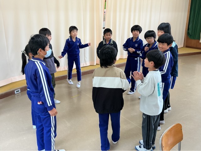 音楽科「リズムでなかよくなろう」の授業の様子です。「タン タン タン タン」「タタ タタ タン ウン」などの4拍子のリズムの中から自分で好きなものを選び、輪になってリレーで順番に手拍子をしていきます。