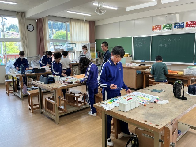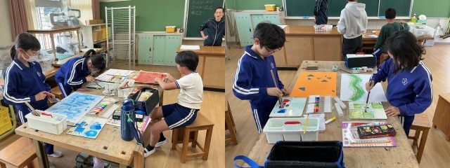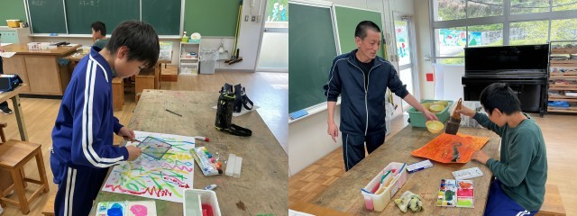 図画工作科の授業の様子です。6年生の図画工作科は教務主任が担当します。今日は「なんの音?」として、絵の具を使って音を表しています。音から連想される色や形などのイメージを、にじみやぼかし、スパッタリングなどの技法を用いて表現しています。何の音か、とても気になります。
