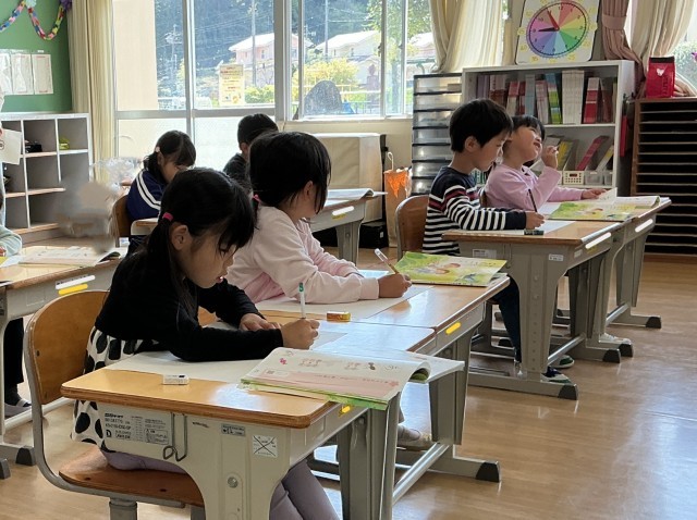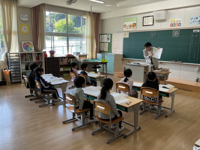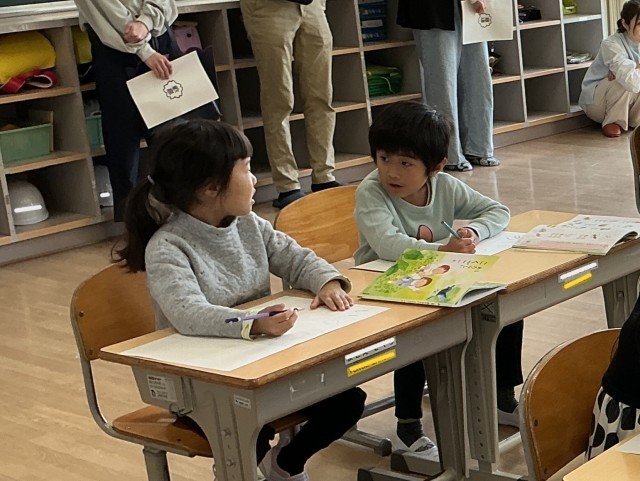 入学して初めての授業参観です。国語科「あいうえおのことばをあつめよう」の学習の様子です。今日は、「あ」と「い」のつく言葉をペアで協力して集めます。一度だけ、参観している保護者の方にも聞いてよいことになっていますが、ペアと相談しながらたくさん集めていました。