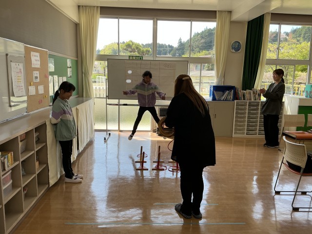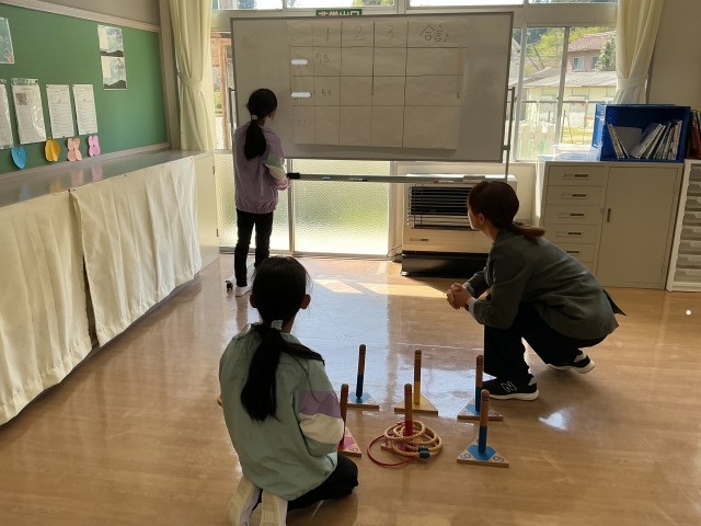 写真上・中:お家の方と輪投げ対決をしました。的になる棒によって、得点が異なるため、何点のところにいくつ輪が入ったか、かけ算で計算して合計点を出します。輪投げはお家の方の圧勝でしたが、かけ算もたし算も正しく計算することができました。