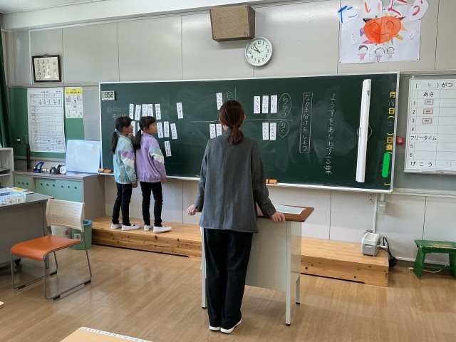 写真下:「ようすをあらわす言葉」の学習の様子です。「にこにこ」「げらげら」「わんわん」「ぱくぱく」など、たくさんの様子を表す言葉を、「笑う」「泣く」「怒る」「喜ぶ」といった動作に仲間分けをしました。「ほくほく」「おんおん」など、迷う言葉もありましたが、2人で相談しながら行っていました。