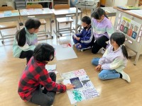 理科「春を見つけよう」の授業の様子です。校庭で「春さがし」をしています。藤棚の藤や地面を歩くアリ、芝生で跳びはねるカエルなどを見つけ、学習用タブレットで撮影しました。他には、どんな「春」を見つけられたかな。