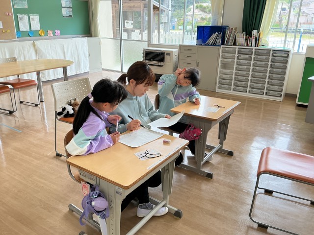 写真上・中:算数の授業の様子です。かけ算の筆算に取り組んでいます。ミスなく計算できていて、花丸をもらいました。