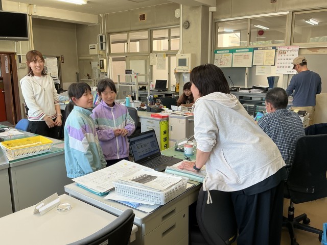 写真下:書写の授業の持ち物を、教科担当の先生に聞きに来ました。「次の書写の持ち物は何ですか」少し緊張していましたが、しっかり言えましたね。