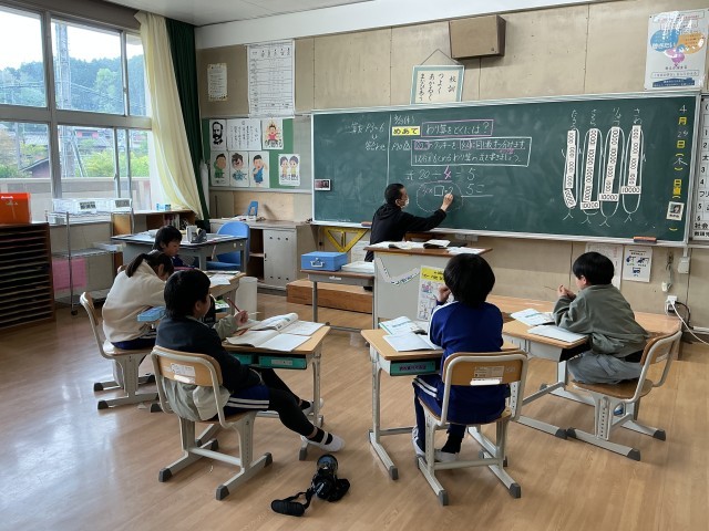 算数科「わり算」の授業の様子です。「20個のクッキーを4人に同じ数ずつ分けます。一人分を求めるわり算の式を書きましょう」という問いに、子どもたちはすぐに「20÷4」という式を立てました。具体物を操作して確かめると、一人分は5個だと分かりました。「20÷4=5」ということは分かりましたが、どのように計算したら5になるのかをみんなで話し合いました。どうやら、かけ算が関係しているようです。