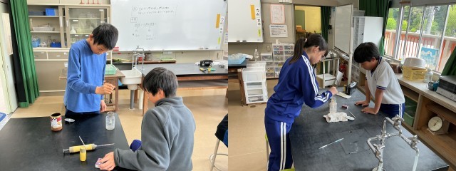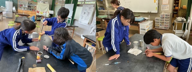 理科「ものの燃え方」の学習で、ものが燃える前と燃えた後の空気には、どのような違いがあるのかを機体検知管を使って調べています。二酸化炭素の検知管は、紫色に変色した部分がたくさん増えていました。