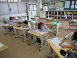1年生が、国語の授業でカタカナを書く練習をしました。子どもたちは手本を見ながら...