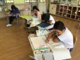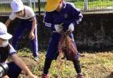 昼の休み時間に、縦割りの「なかよし班」で、春に苗を植えたサツマイモを収穫しまし...
