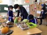 1年生が5時間目に生活科の授業で、学級園で育てたカボチャを使った「おばけカボチ...