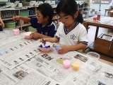 1年生が図工の授業で、絵の具を混ぜて色水を作りました。色を混ぜ合わせる度に変化...