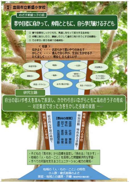 さて、新盛小学校は、一人一人を大切にする教育を展開しています。そして、子どもが、自分の夢や目標に向かって、自ら学び続けることができるような人間になることを目指しています。その重点の一つとして、思いや考えを表現する力を伸ばしていきます。新盛小学校では一行詩やお話集会などの思いを表現する活動を大切にしてきました。さらに、日々の授業や行事、地域の方と触れ合う活動を通して、子どもが自分の言葉で、自分の思いや考えを語り合うことができるように支えていきます。