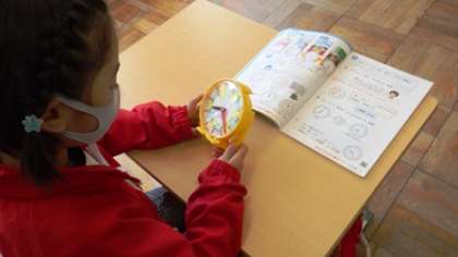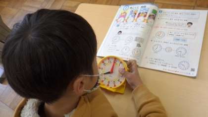 時計を使って時間を表す学習をしています。「8時23分の時計にしてみましょう」と先生に言われると、素早く時計の針を動かしています。