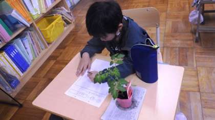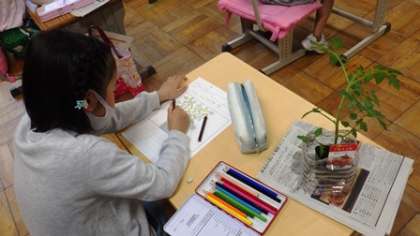 今日は朝から雨でしたが、みんな元気に登校しました。ミニトマト、ピーマンなど、これから育てる夏の野菜の観察を教室でしました。