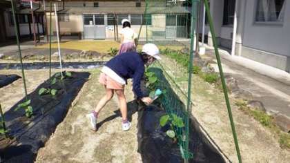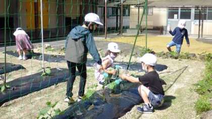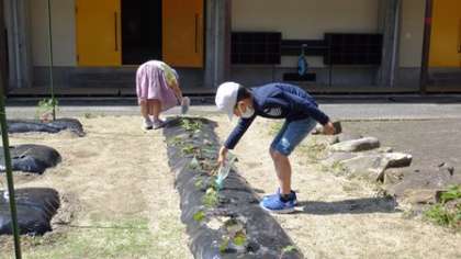 1・2年生が畑に植えたミニトマト、ナス、ピーマン、トウモロコシ、サツマイモが元気に育っています。今日も水やりを懸命に行いました。