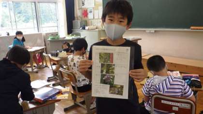 自分で撮った花、虫、カエルなどの写真を使って、学校のまわりにいる生物のまとめをつくっています。