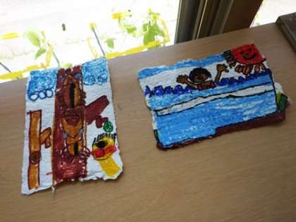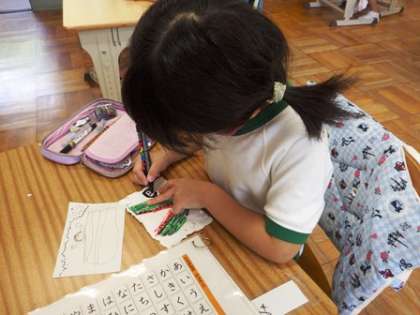自分たちで作った手作りのはがきに夏の絵を描きました。マジックやポスカを使い、細かいところまで丁寧に描いていました。