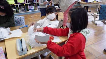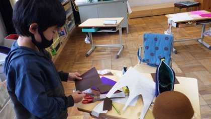 1・2年生は、学芸会で劇「おおかみと四匹の子やぎ」を披露します。今日は、おおかみや子やぎの衣装づくりです。耳の形や大きさを考えて、厚紙を切り、色を付けていました。