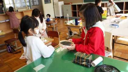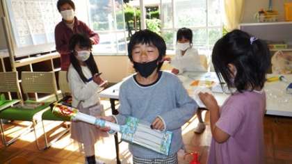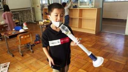 身の回りの物を使って、楽器を作っています。マイク、マラカス、ドラム、ギタ—もあります。