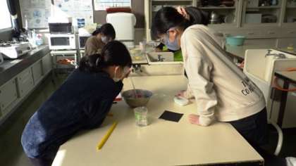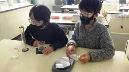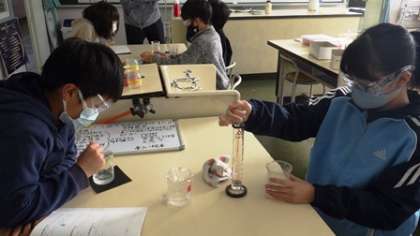 前回の授業で溶けなかった塩をどうしたら溶かすことができるのか、考えて実験しています。