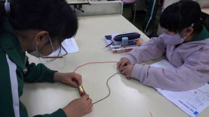 11月22日 3・4年理科 公開日 2021/11/22 更新日 2021/11/22 各学年から 11月22日 3・4年理科 電池と導線を使って、どんなときに豆電球が点くのか条件をまとめ、実際に点けています。ソケットを使わずにつないでみると・・・なかなか難しいようです。しばらくすると「点いた!」とあちこちから聞こえてきました。 3年 4年