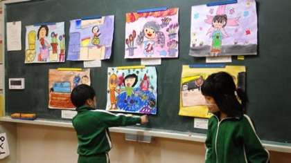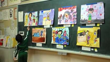 完成した自分の読書感想画について発表しています。みんなの絵を見て、よいところを見つけています。