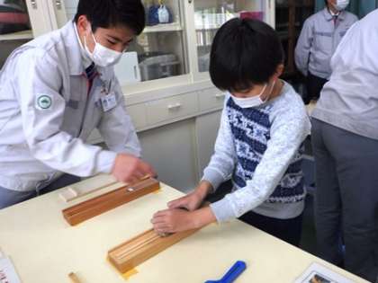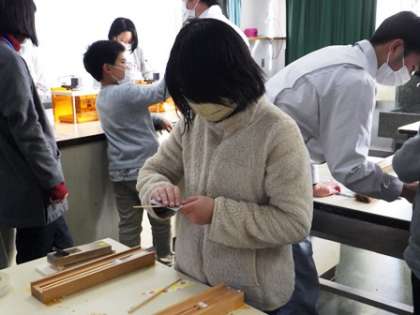 12月15日 3〜6年ものづくり 公開日 2021/12/15 更新日 2021/12/15 各学年から 12月15日 3〜6年ものづくり 今日の午後、トヨタ自動車の方々を講師に、箸づくりを行いました。ヒノキを削り、レーザーで車のイラストと自分のイニシャルを焼き入れました。 3年 4年 5年 6年