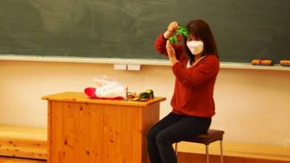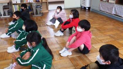 今年度の低学年の読み聞かせは、「はらぺこあおむし」のハンドシアターから始まりました。楽しくお話を聞いた後、「わすれもの大王」を読んでいただきました。