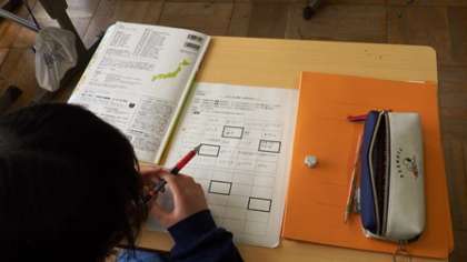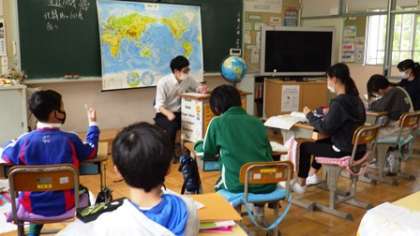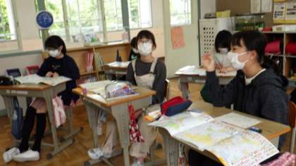 国の名前のビンゴを作っています。地図を見ながら、たくさんのマスを国名で埋めていました。