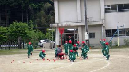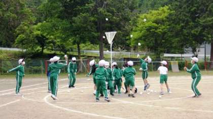 「玉入れ」の練習です。高学年が入れるときは、かごを担当の先生が振っています。それでもどんどん入っていました。さすがです。