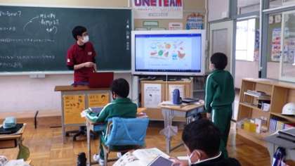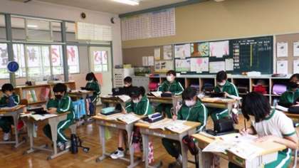 自分たちの身の回りにあるものと産業の関係を学習しています。タブレットや資料集を使って調べていました。