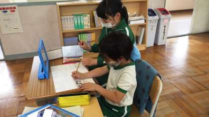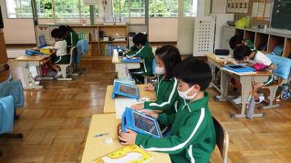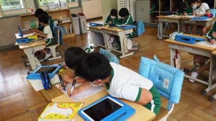 豊田市の公共施設について、ペアで調べてまとめています。タブレットや資料集などを使って、協力して調べ学習をすすめていました。