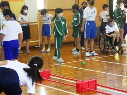 今年度1回目のあすけ集合学習。高学年は御蔵小学校で、学級活動「久しぶりだね(自己紹介ゲーム)」と体育「ランボール(ボッチャ)」を行いました。