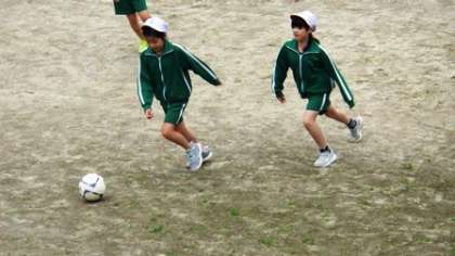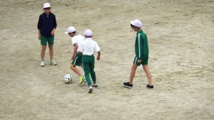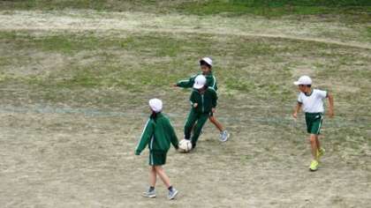 グループでサッカーボールを取り合っています。相手の隙をついて、ボールを蹴っていました。