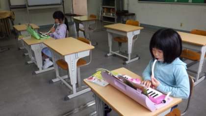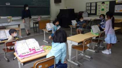 「かっこう」をうたった後、鍵盤ハーモニカで「かっこう」と聞こえるように演奏するにはどうしたらよいか話し合っていました。「とまっている感じ」「はずんでいる」など、小さな「つ」の部分をどう感じるか、自分の意見を発表していました。