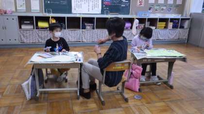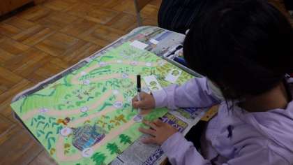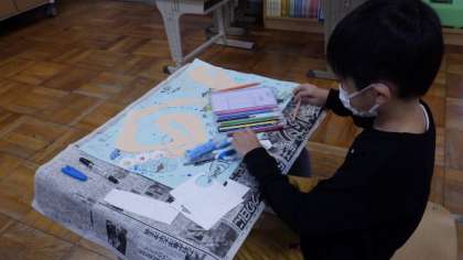 「おすし」や「飲み物」などを描いた「皿」を画面に貼っています。細かな部分もていねいに描いていました。