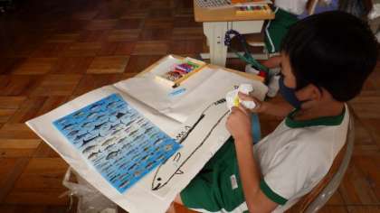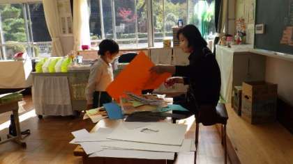 もうすぐ、大蔵こども園の年長さんとの交流会です。そこで行うゲームのために、いろいろな魚の絵を描いて切り抜いています。