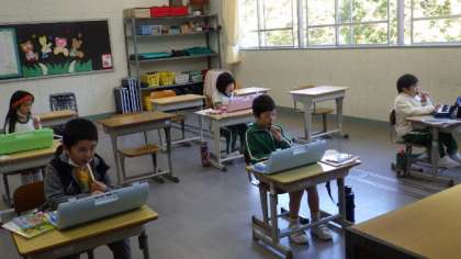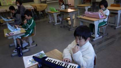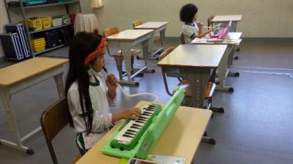 先生が弾く音を聴いて、同じ高さの音を鍵盤ハーモニカで演奏しています。3つの連続した音の高さがどのように変化しているのか、真剣に聴き取っていました。
