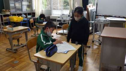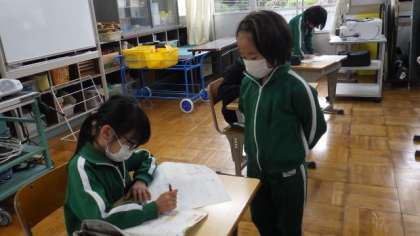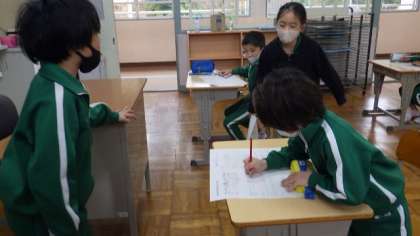 11月29日 3年算数 公開日 2022/11/29 更新日 2022/11/29 各学年から 11月29日 3年算数 「式と計算」で学習した式のしくみの問題をそれぞれ作り、みんなで解いています。自分の問題は先生役となって丸つけをします。わからないところがあると、やさしく教えていました。 3年