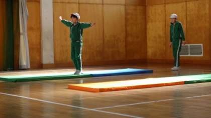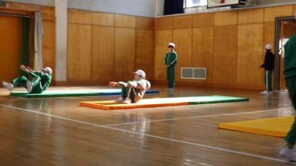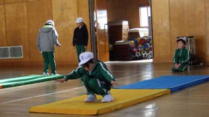 マット運動の練習です。前転、開脚前転、後転など、自分の練習したい技ごとに練習していました。