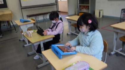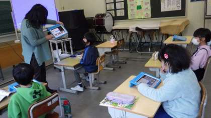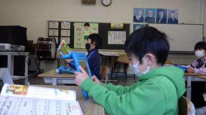 タブレットの中のアプリを使って、いろいろな楽器の音を確かめたり、短い曲を弾いたりしています。