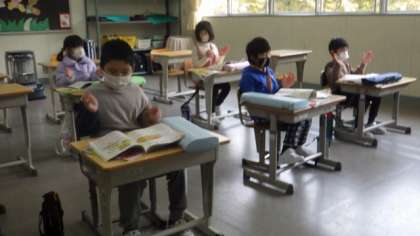 階名(ドレミ…)で曲を歌いながら、フレーズの終わりで手を打っています。けっこう難しいのですが、みんな上手に歌い、タイミングよく手を打っていました。