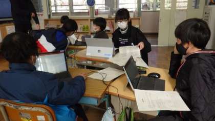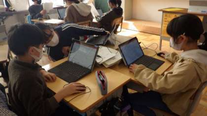 25日の新盛学習発表会に向けて準備をしています。どんな言葉や画面にすればよいか、グループで相談していました。