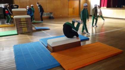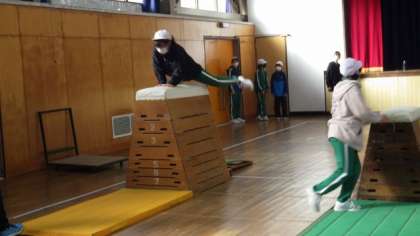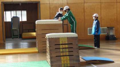 2月7日 5・6年体育 公開日 2023/02/07 更新日 2023/02/07 各学年から 2月7日 5・6年体育 跳び箱を使って、台上前転の練習をしたり、高い段に挑戦したりしています。アドバイスをを先生にもらって何度も練習していました。 5年 6年