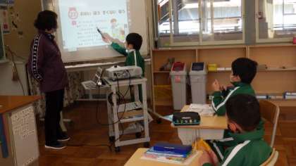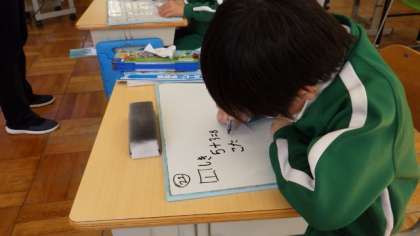 2月28日 1年算数 問題文を読んでどんな問題かを考え、自分が解いた方法をみんなに説明しています。
