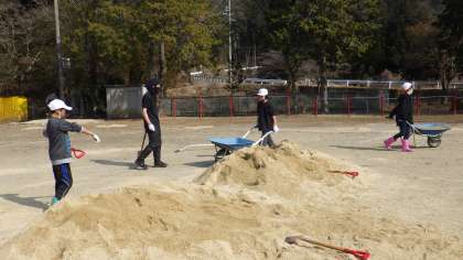 3月8日 6年愛校活動 公開日 2023/03/08 更新日 2023/03/08 各学年から 3月8日 6年愛校活動 6年生が愛校活動として、運動場のトラックに砂を入れています。運動場の真ん中にあった砂の山2つが、瞬く間に運ばれ、トラックがきれいになっていきました。 6年