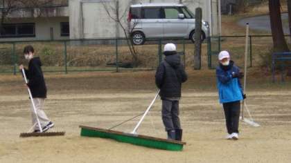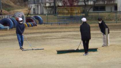 3月10日 6年愛校活動 運動場をきれいにならしています。頼もしい5人です。